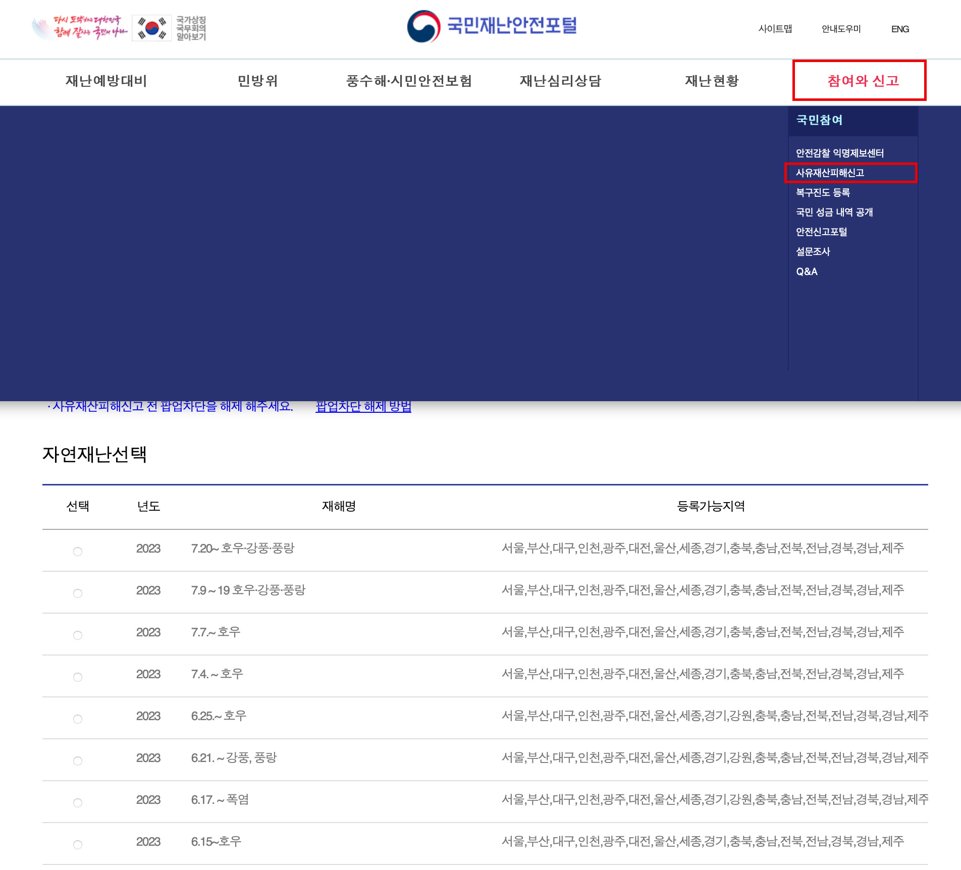 국민재난안전포털 사이트접속 - 상단에 참여와 신고 카테고리 클릭 - 사유재산피해신고 페이지에서 항목  클립 후 신규등록